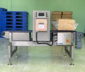 Máy dò kim loại hạt điều dùng để phát hiện và loại bỏ tất cả các kim loại có lẫn trong hạt điều đã đóng bao PE hút chân không hoặc đã đóng thùng carton, ... đảm bảo 100%.
